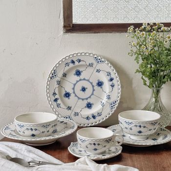 Juego de platos y platillos de cerámica de hierba Tang de encaje completo azul retro francés al por mayor, vajilla desechable de diseño clásico