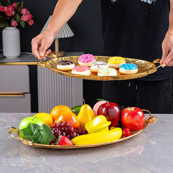 ถาดโลหะทรงรีพร้อมดีไซน์กลวงสีทองสำหรับโรงแรมร้านอาหารที่เก็บขนมลูกกวาดผลไม้ทนทานสำหรับงานหัตถกรรมถาดยาว